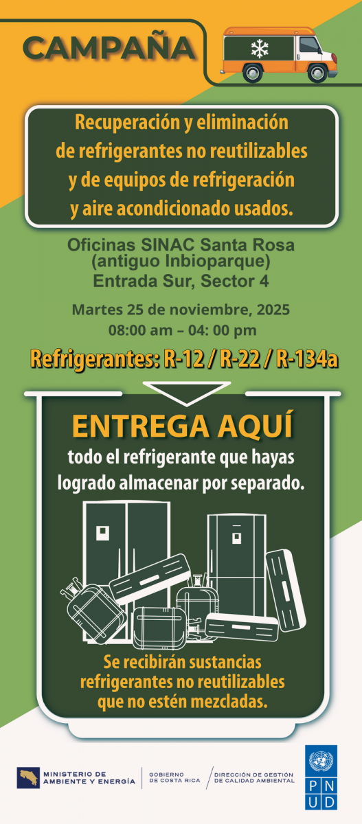 Durante la Campaña un gestor autorizado por el Ministerio de Salud estará recibiendo, sin ningún costo, los volúmenes no reutilizables de gases R-22, R-12, R-134a (únicamente/no mezclados) que su institución haya almacenado, para que sean dispuestos de una forma ambientalmente adecuada. De igual manera se estará recolectando el equipo de refrigeración doméstica (refrigeradoras, congeladores), refrigeración comercial, climatización (mini split, ventana) y los dispensadores de agua, que su institución quisiera disponer.