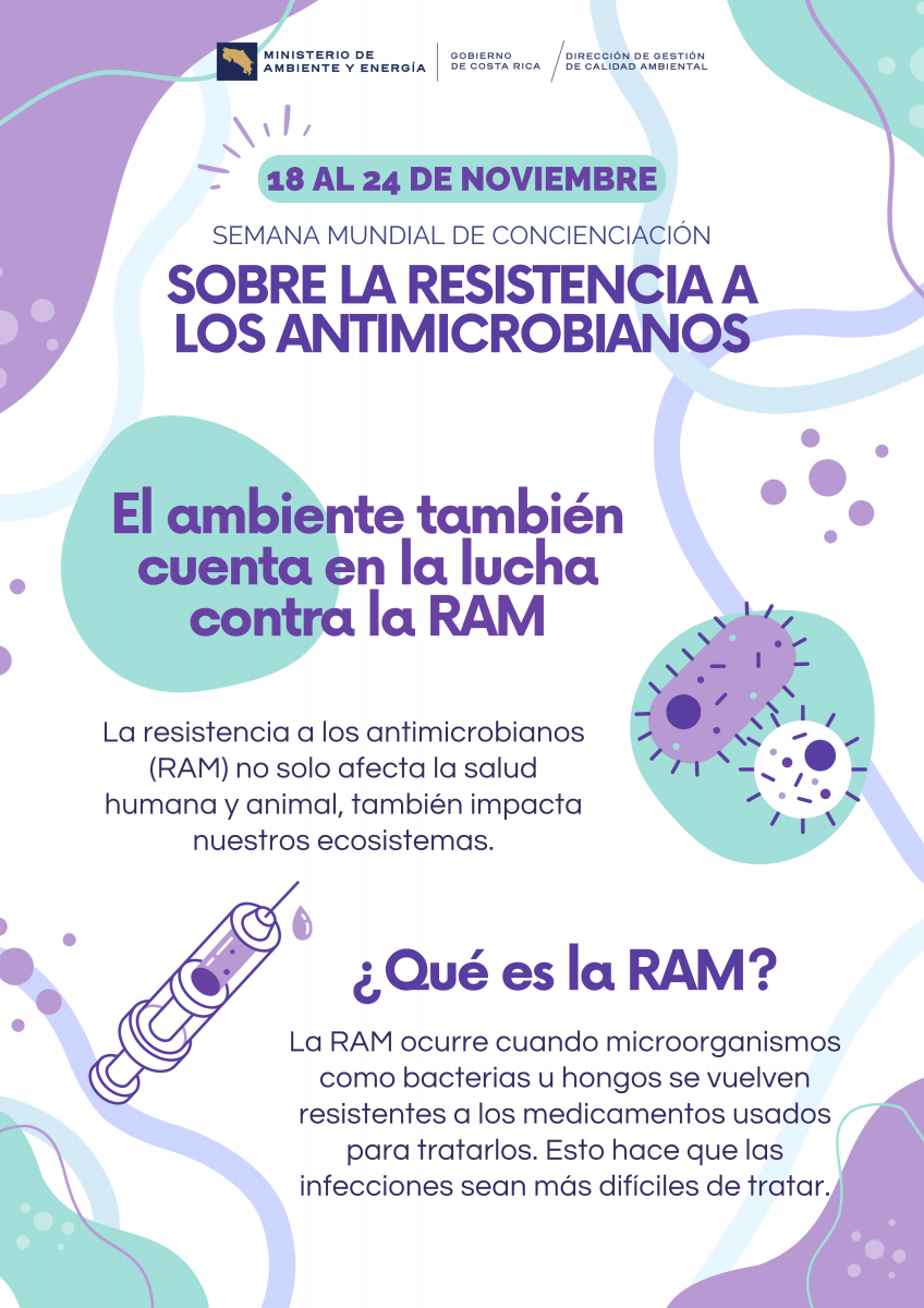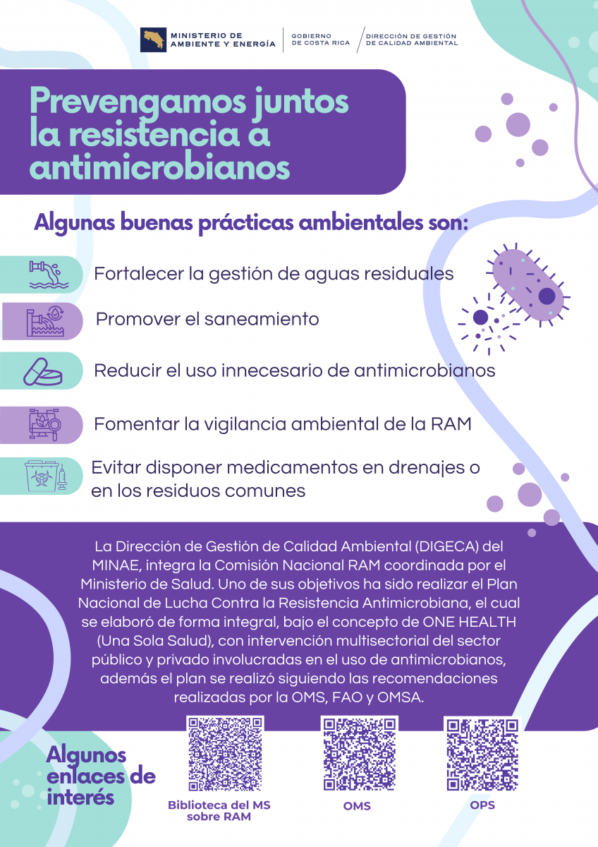 La DIGECA, del Ministerio de Ambiente y Energía, integra la Comisión Nacional RAM coordinada por el Ministerio de Salud. Uno de los objetivos de esta comisión ha sido realizar el Plan Nacional de Lucha contra la Resistencia Antimicrobiana, el cual se elaboró de forma integral, con intervención multisectorial del sector público y privado involucrados en el uso de antimicrobianos, además el plan se realizó siguiendo las recomendaciones realizadas por la OMS, FAO y OMSA.
